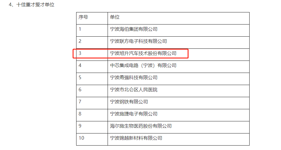 2021年10月8日,寧波市北侖區(qū)人力資源和社會保障局發(fā)布《關(guān)于2021年度北侖區(qū)十佳青年專業(yè)技術(shù)人才、十佳青年“大港工匠”、十佳外來務(wù)工人員“就業(yè)之星”、十佳重才愛才單位、十佳人力資源服務(wù)機構(gòu)評選結(jié)果的公示》,其中,寧波旭升汽車技術(shù)股份有限公司等十家企業(yè)獲得北侖區(qū)“十佳重才愛才單位”榮譽稱號。