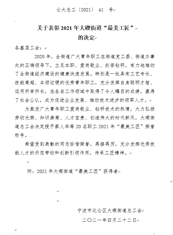 為激發廣大青年職工愛崗敬業、鉆研技術的熱情,大力弘揚勞動光榮、知識崇高、人才寶貴、創造偉大的時代新風,大碶街道總工會決定授予蔡人華等20名職工2021年“最美工匠”榮譽稱號。