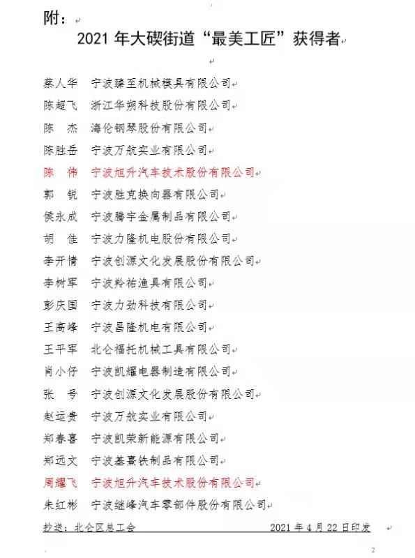 祝賀旭升股份周耀飛、陳偉兩位員工榮獲北侖區大碶街道“最美工匠”稱號——他們堅守精益求精的工匠精神,在平凡的崗位上踐行著不平凡的堅守,以實際行動書寫愛崗敬業的職業精神!